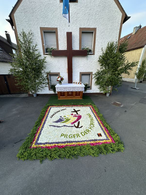 Auch diese traditionelle, religiöse Veranstaltung unserer Kolpingsfamilie stand heuer wieder auf dem Programm. Am Vortag von Fronleichnam trafen sich Kinder, Jugendliche und Erwachsene ab 13:30 Uhr zum Blumen pflücken und sammeln. Ab 17 Uhr wurde dann der Blumenteppich von einigen Frauen und Kindern in der Garage bei Kaiser’s (Dameradl) eifrig gelegt. Dabei hatten sich Sophie Müller und Carolin Kellner, die neuen Verantwortlichen für diese Veranstaltung, wieder ein sehr schönes Motiv ausgesucht. „Pilger Der Hoffnung im Jubiläumsjahr 2025“. Fünf fleißige Männer bauten zur gleichen Zeit den Altar am Prozessionsweg auf.
